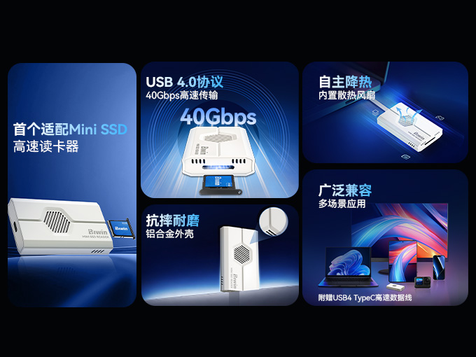 RD510高速读卡器是首款适配Mini SSD的高速读卡器,提高Mini SSD产品的适用场景,应用更灵活。